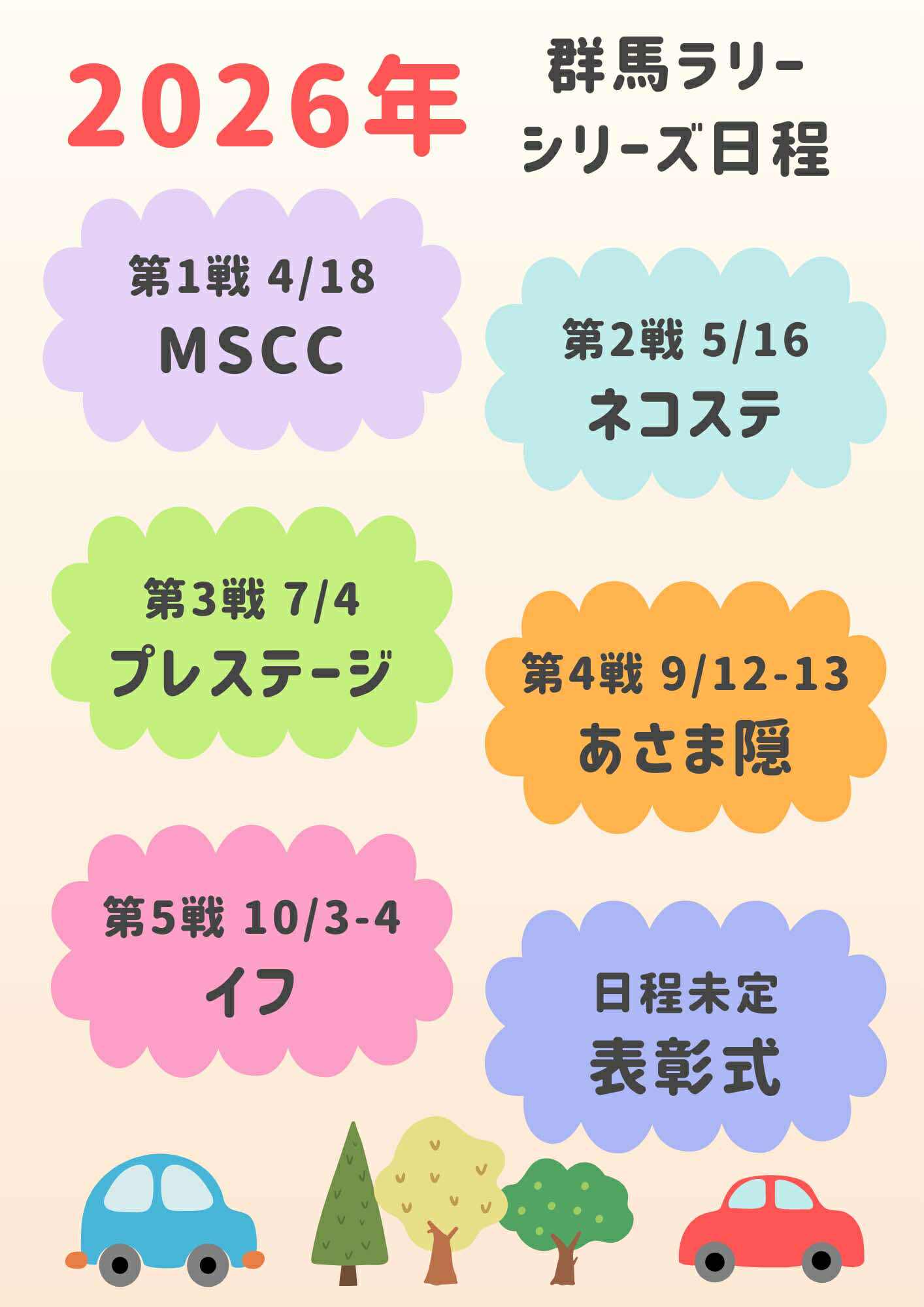 2026年JMRC群馬ラリーシリーズ開催スケジュールのお知らせ 2025.12.03 新着情報 2026年のJMRC群馬ラリーシリーズの開催スケジュールをお知らせします。 来年も多くの参戦をお待ちしています!