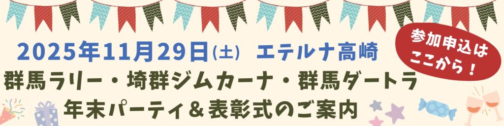 年末パーティ&シリーズ表彰式を、JMRC群馬(群馬ラリーシリーズ・埼群ジムカーナシリーズ・群馬ダートラ部会)で合同開催します。群馬戦に参戦された選手やオフィシャルの皆さんに、ぜひお気軽に参加いただき、情報交換や忘年会の場として、皆さんでわいわいと楽しんでいただけたら幸いです。